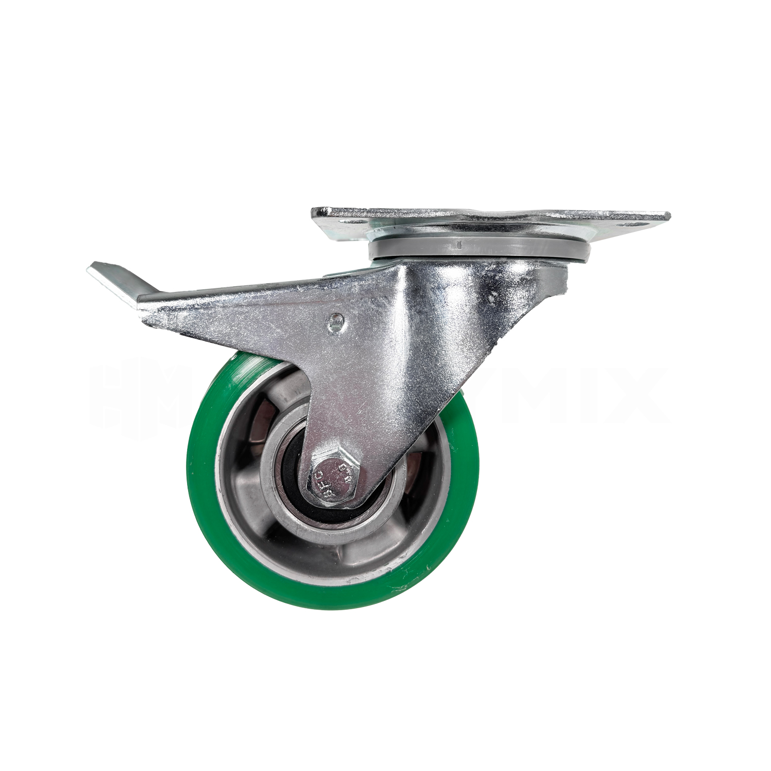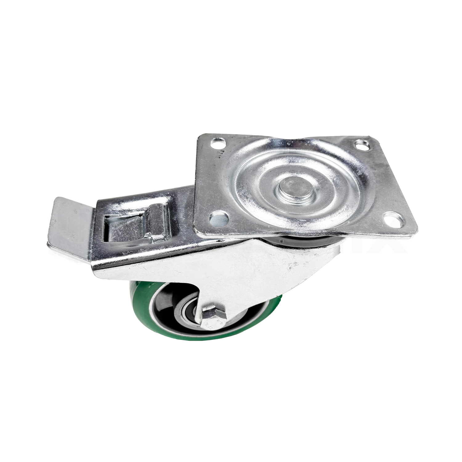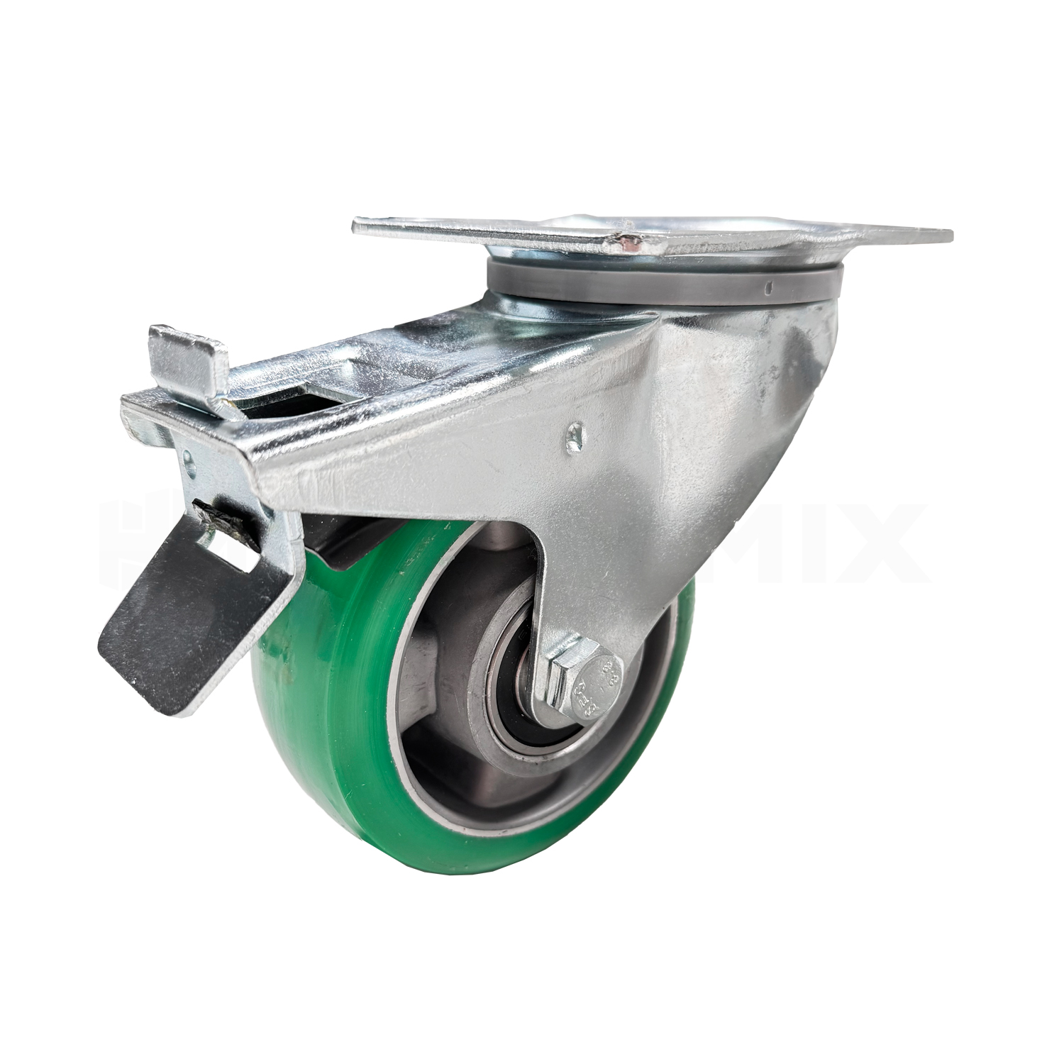 Pyörä on varustettu jämäkällä täysjarrulla, joka lukitsee luotettavasti sekä pyörän että kääntökehän. Runko on paksua, sähkösinkittyä terästä ja kääntökehässä on vahvistettu laakerointi, mikä takaa pitkän käyttöiän vaativissakin olosuhteissa.