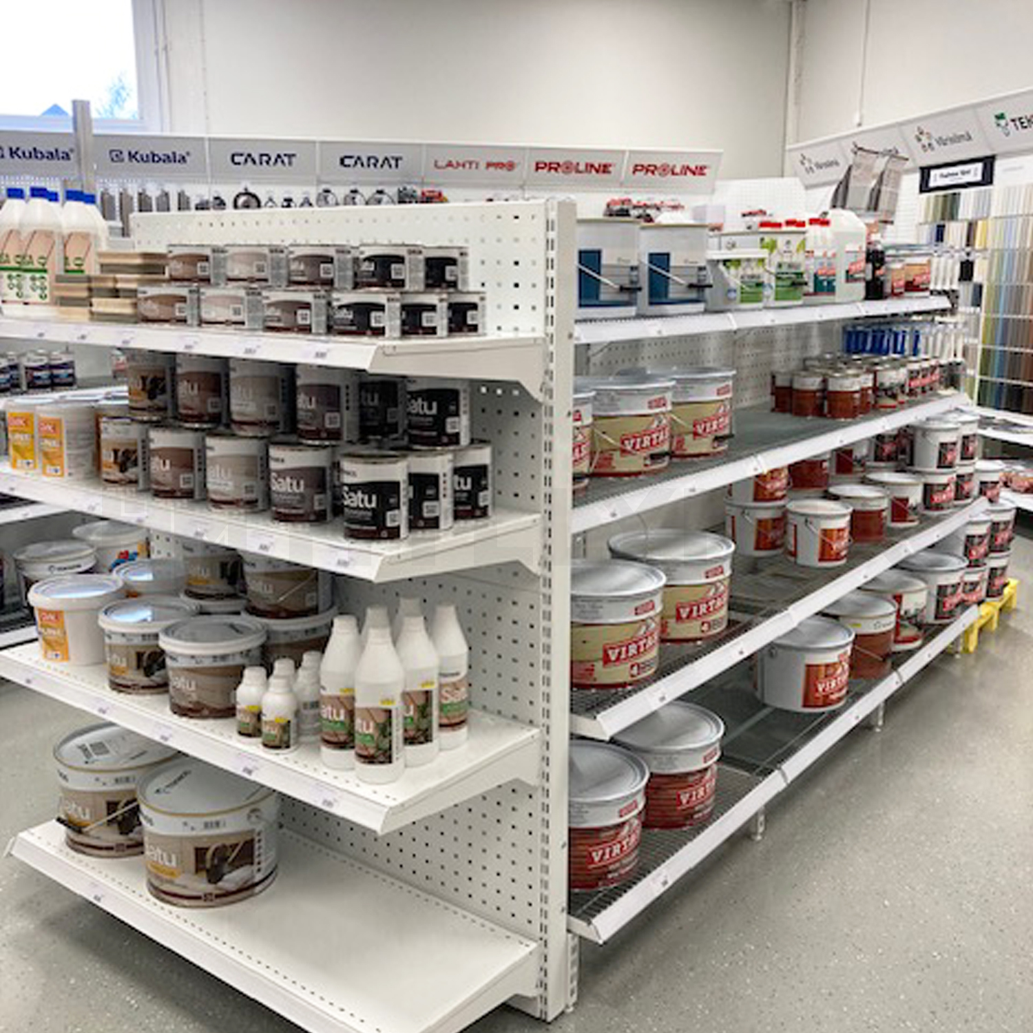 Myymälän kalustejärjestelmät kestävät päivittäistavaroiden, maatalouskaupan, rautakaupan ja puutarhakaupan tuotteiden kuormitukset ilman seinäkiinnityksiä. Myymäläkalusteet ovat helposti muunneltavissa ja mahdollistavat tilan käyttöä tuottavasti ja käytännöllisesti. Tällä kalustejärjestelmällä sisustetaan myymälöiden lisäksi myös varastot, korjaamot ja tuotantotilat toimiviksi. Runkoputkiin voidaan kiinnittää esim. hyllytasoja ja vaaterekkejä. Taustat syntyvät reikälevyistä ja sileistä taustoista.Varastoimme pääsääntösesti Itab:n, Pikval:n ja Expedit:n kalusteosia. Osa, eri valmistajien tuotteista, ovat yhteensopivia ja jonkun tuoteryhmän puuttuessa voimme täydentää uusilla tuotteilla. Käytettyjen myymälähyllyjen kokonaishinta vaihtelee rakennelmasta ja lisä-osista riippuen. Toivomme asiakkaan yhteydenottoa ja tiedustelua ennen tilausta jotta voimme tarjota tuotteita tarpeiden mukaan ja varmistaa saatavuuden. Valikoimaan kuuluu myös täysin uusia myymäläkalusteita. Autamme teitä mielellään suunnitteluvaiheessa. Miettikää seuraavia asioita ennen yhteydenottoa: