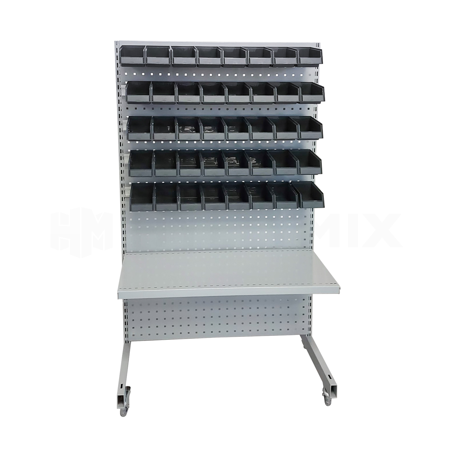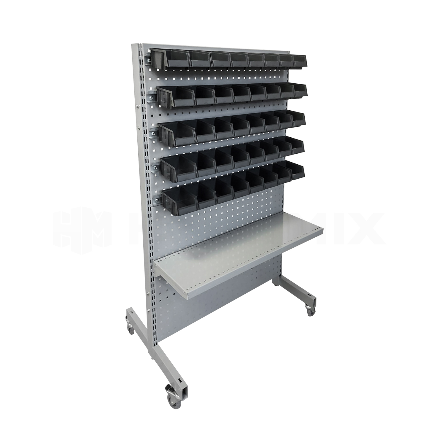 Kaksipuolinen ottolaatikkoteline pyörillä. Kuvien mukainen hylly jossa molemmat puolet identtiset.