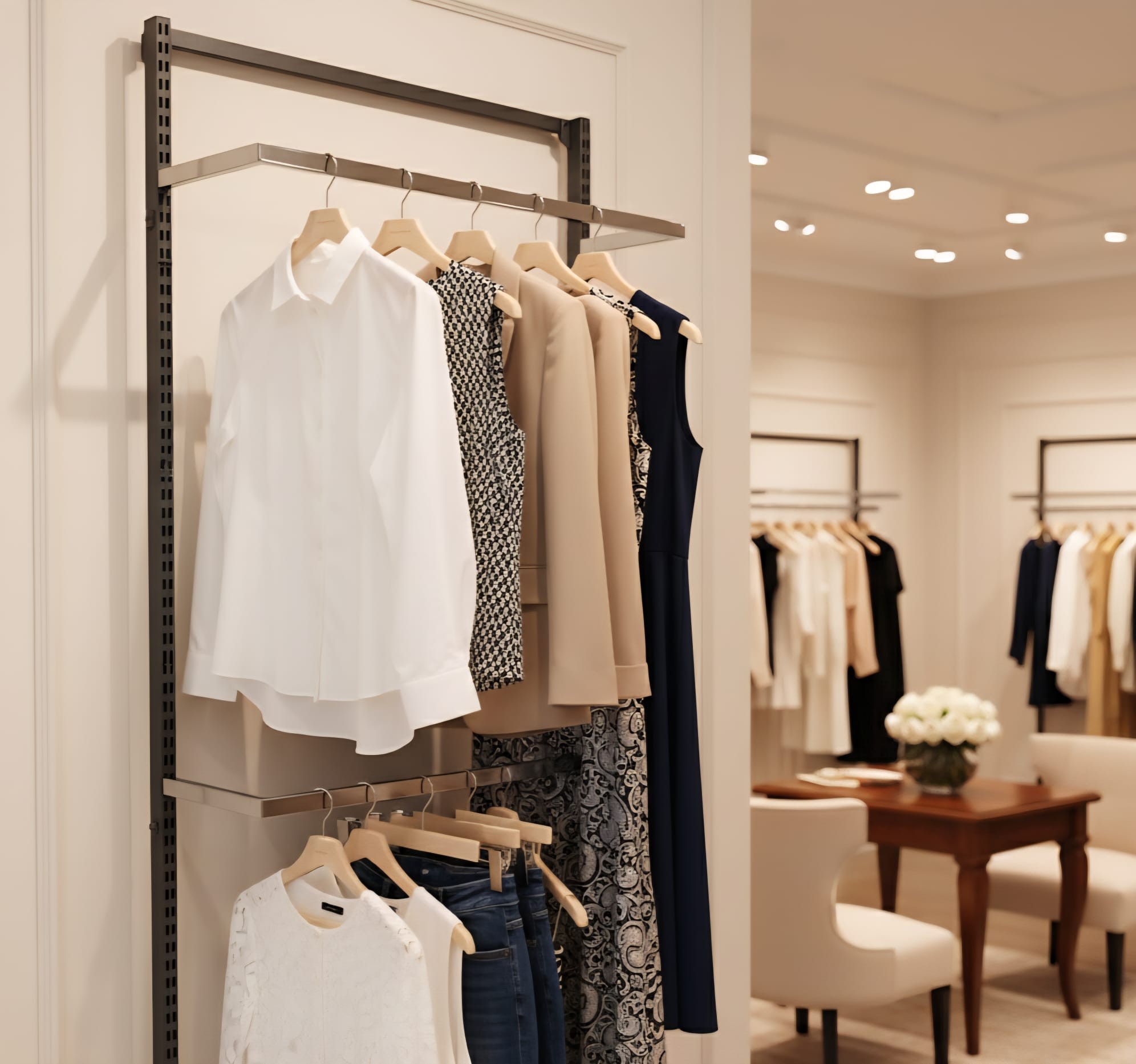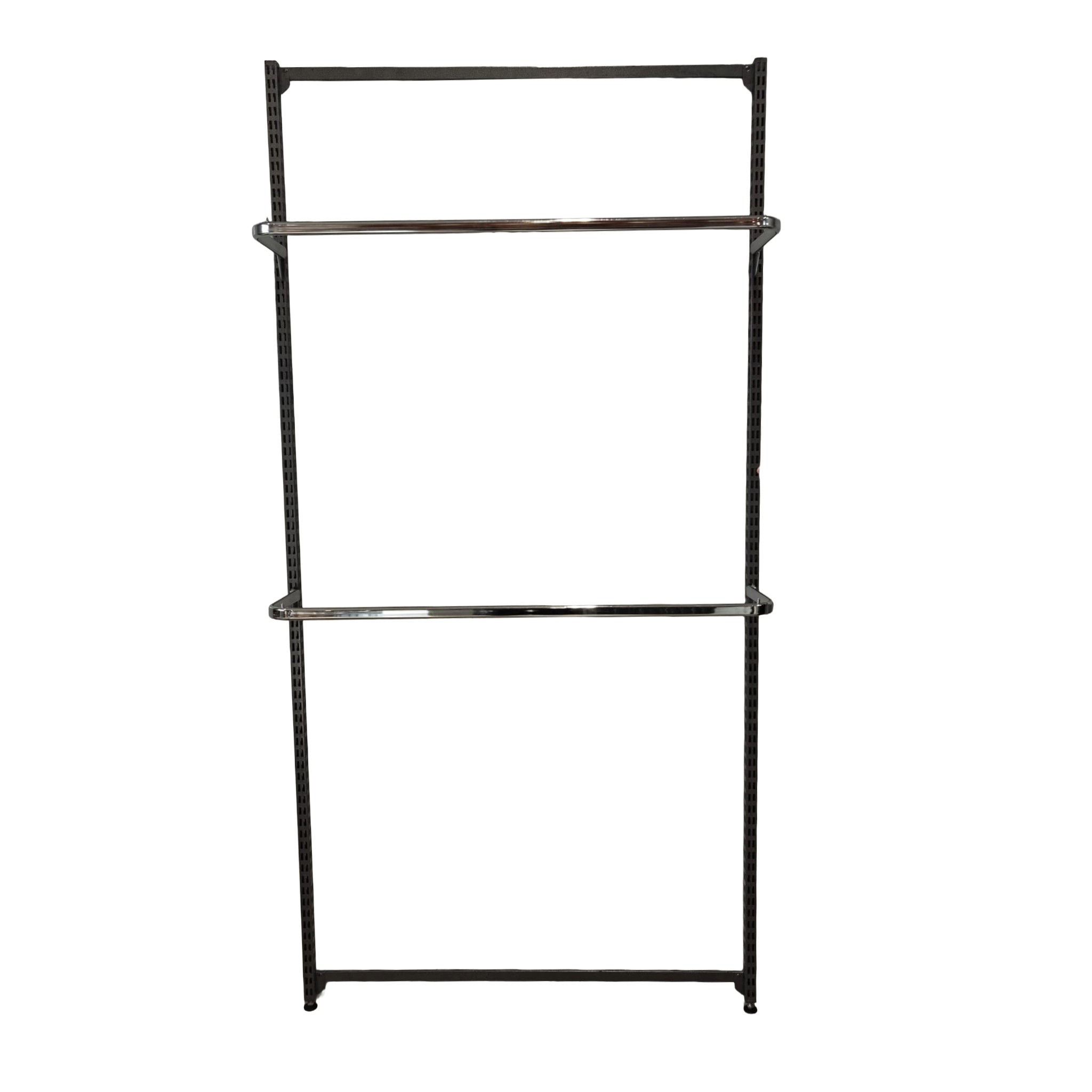 Seinään kiinnitettävä vaateliikkeen kaluste. Hyllyn runko koostuu pystytolpista ja vaakatuista. Rungon väri on musta/hopea varsaralakka. Pystytolpan alaosa tulee lattiaa vasten ja siinä on säätöruuvi. Kiinnitysruuvit seinään eivät tule mukana.