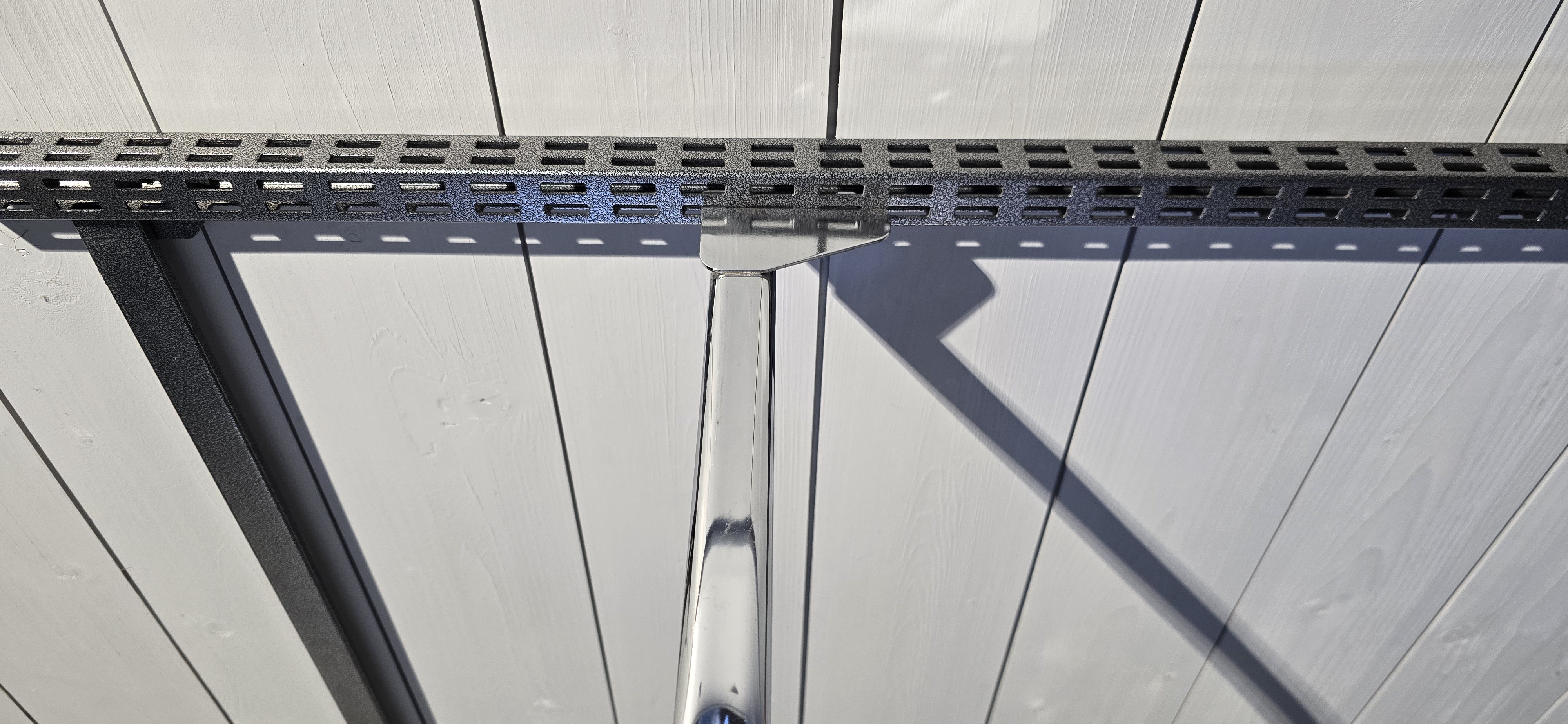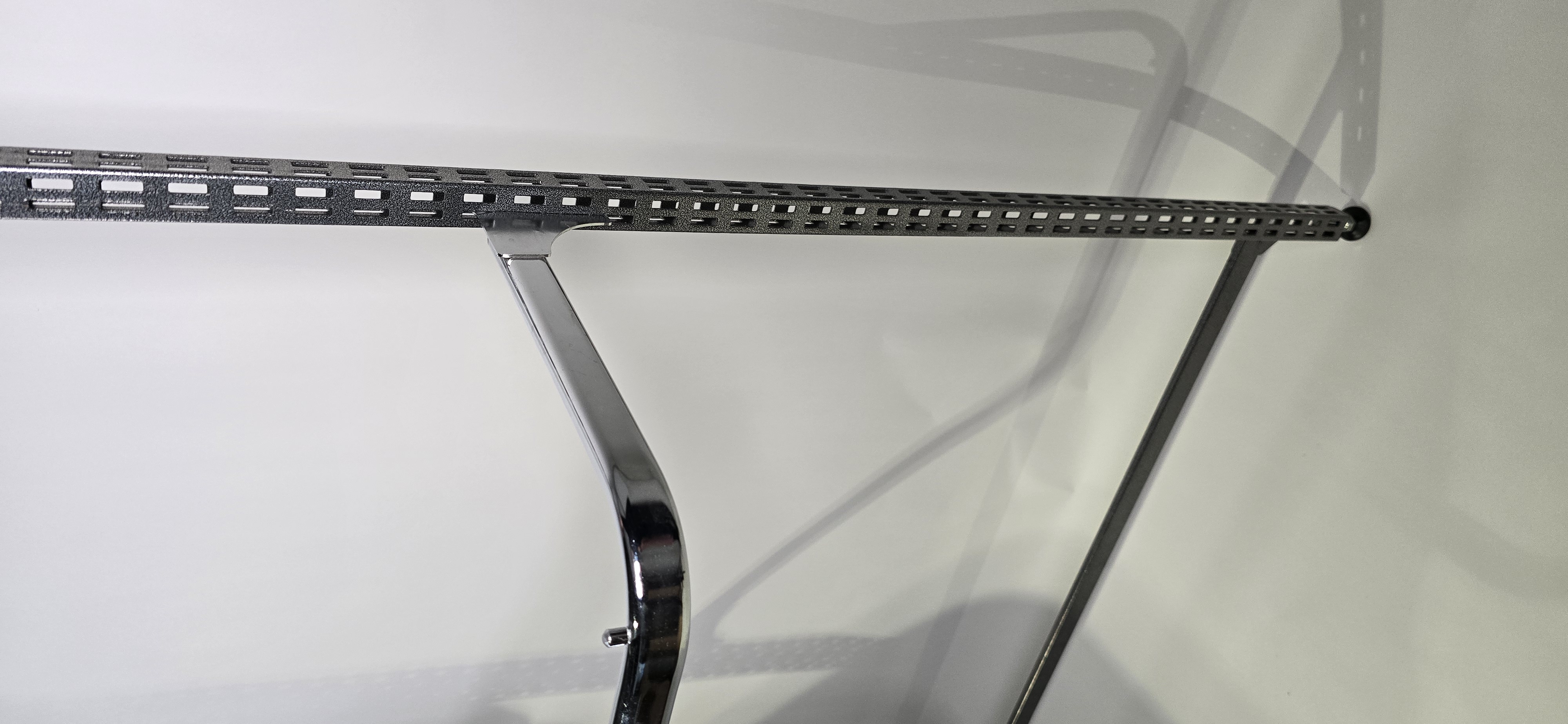 Varusteluosina hyllyssä on kaksi ulkonevaa kromattua rekkitankoa.