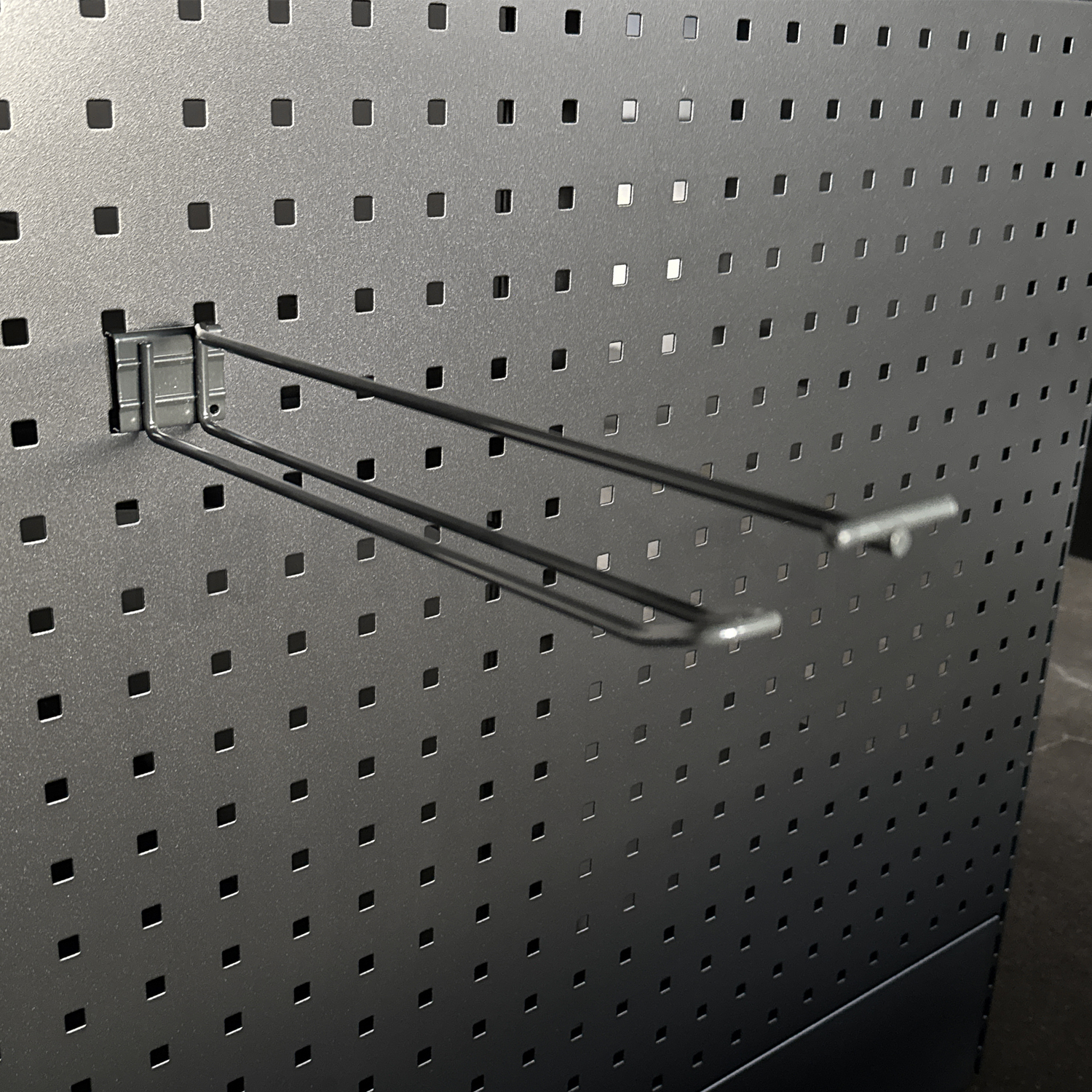 Begagnad gråsvart dubbeltrådad spjut med etiketthållare till perfotavla/ verktygstavla. Tillverkad av 5 mm tråd och är 30 cm lång.