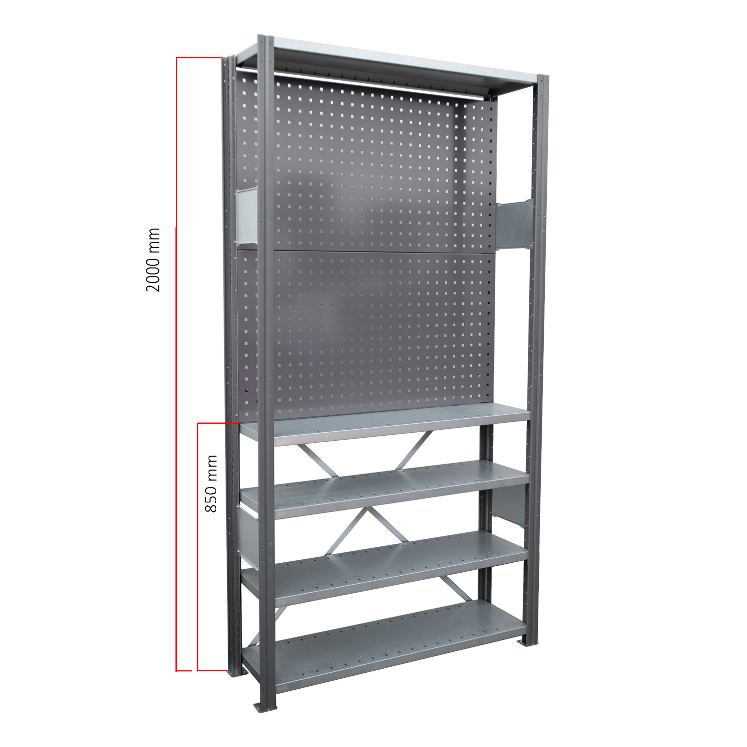 Smågodshyllans gavel och verktygstavla är mörkgråa, RAL7024 och hyllplanen, rygg-stag och stagplåt är sinkade.