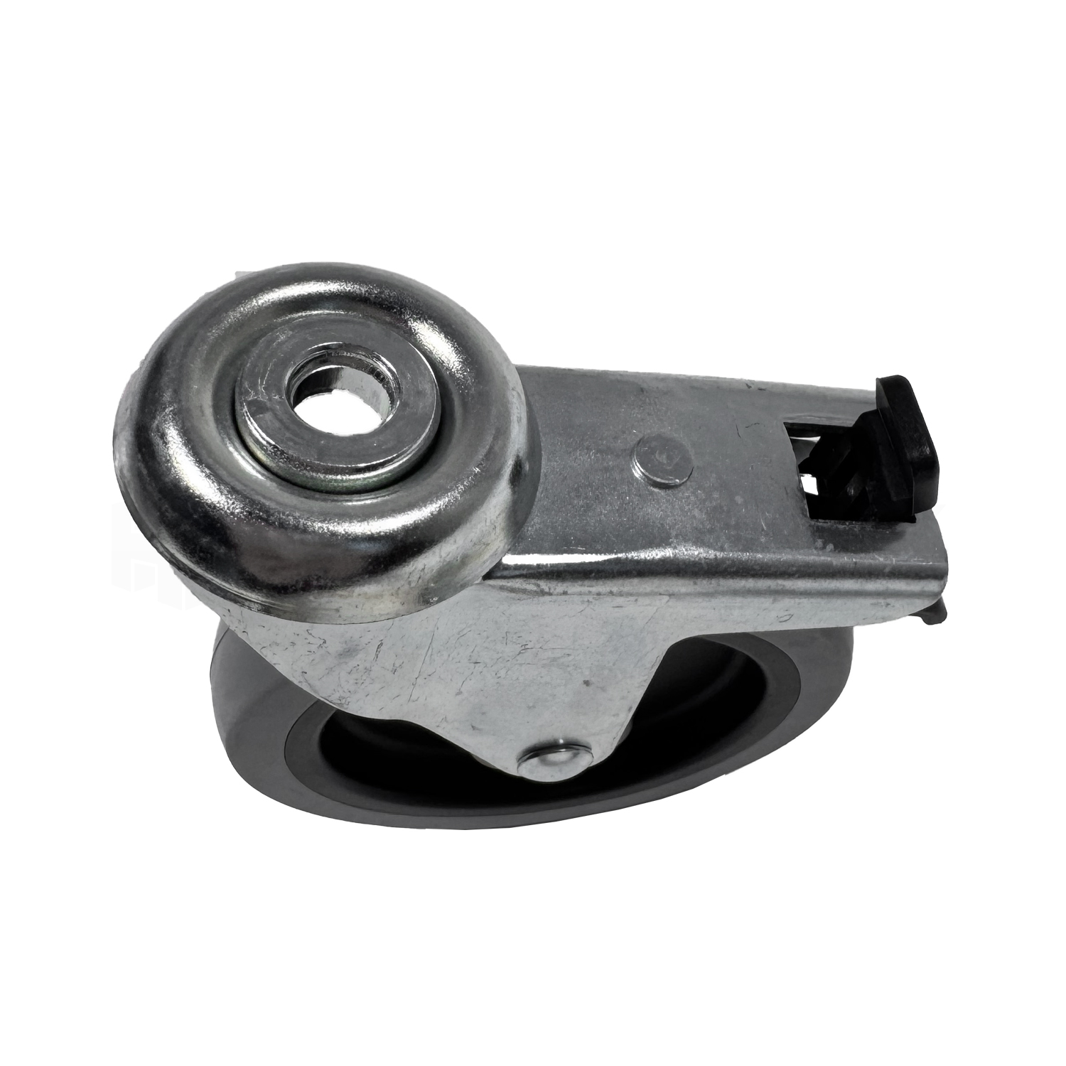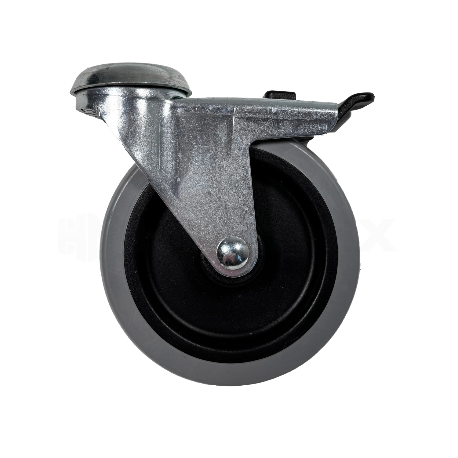 Hjulet har en löpbana av högkvalitativt termoplastiskt gummi (TPE) som rullar mycket tyst och lätt. Den grå löpbanan är skonsam mot golv och lämnar inga märken, så den passar bra även för känsliga golvytor. Hjulet är utrustat med en pålitlig totalbroms som låser både hjulets rotation och vridkransens rörelse samtidigt, vilket säkerställer att utrustningen står stadigt.