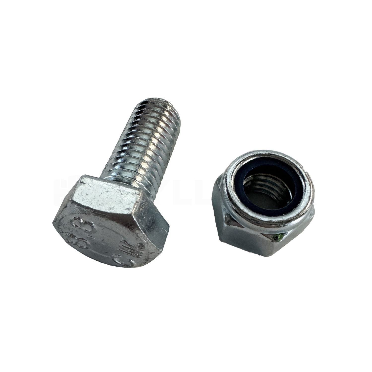 Skruv och mutter för fastsättning av stosfotplatta i EAB pallställets gavelstolp.