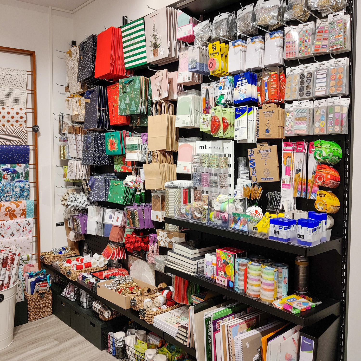 Väggskenorna låter butiksväggen eller förvaringsutrymmet leva enligt behov. Kombination av hyllor, konfektionsbågar och olika ryggskivor med krokar eller hängare erbjuder en funktionell och effektiv exponeringsvägg.